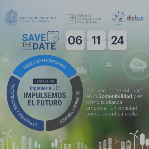 La Escuela de Ingeniería UC, Dictuc y el Colegio de Ingenieros de Chile tienen el agrado de invitar a participar en el II Encuentro Ingeniería UC: Impulsemos el futuro, instancia diseñada para generar y fortalecer oportunidades de vinculación entre organizaciones y las áreas de formación profesional; asesorías y servicios e investigación y desarrollo.